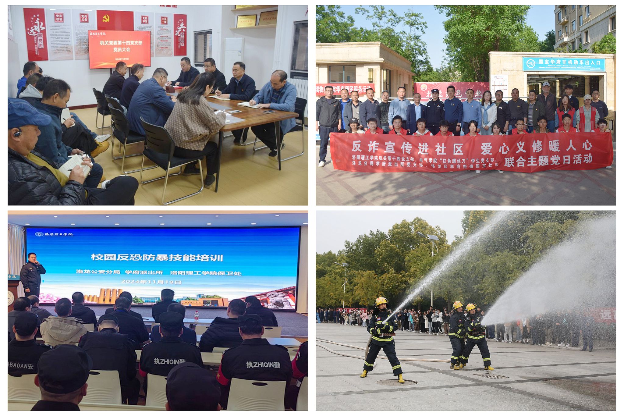 2.苦练,练就铁的本领。支部以“管理、专业、技术、核心技能”四支人才队伍培养为重点,依托“机关大讲堂”持续加强全员政治理论、体系文件、专业技能、安全管理等知识的培训;充分利用洛阳市消防支队、反恐支队、国保支队和辖区派出所等消防和警务资源开展岗位大练兵、科技创新、技能比武,以赛促练。先后开展安保人员能力素质提升培训班6期,累计培训300余人次。支部8名退伍军人成立了“老兵突击队”,在校园安全攻坚克难、紧急响应、设施自主维保等急难险重面前敢于亮剑,勇于冲锋。