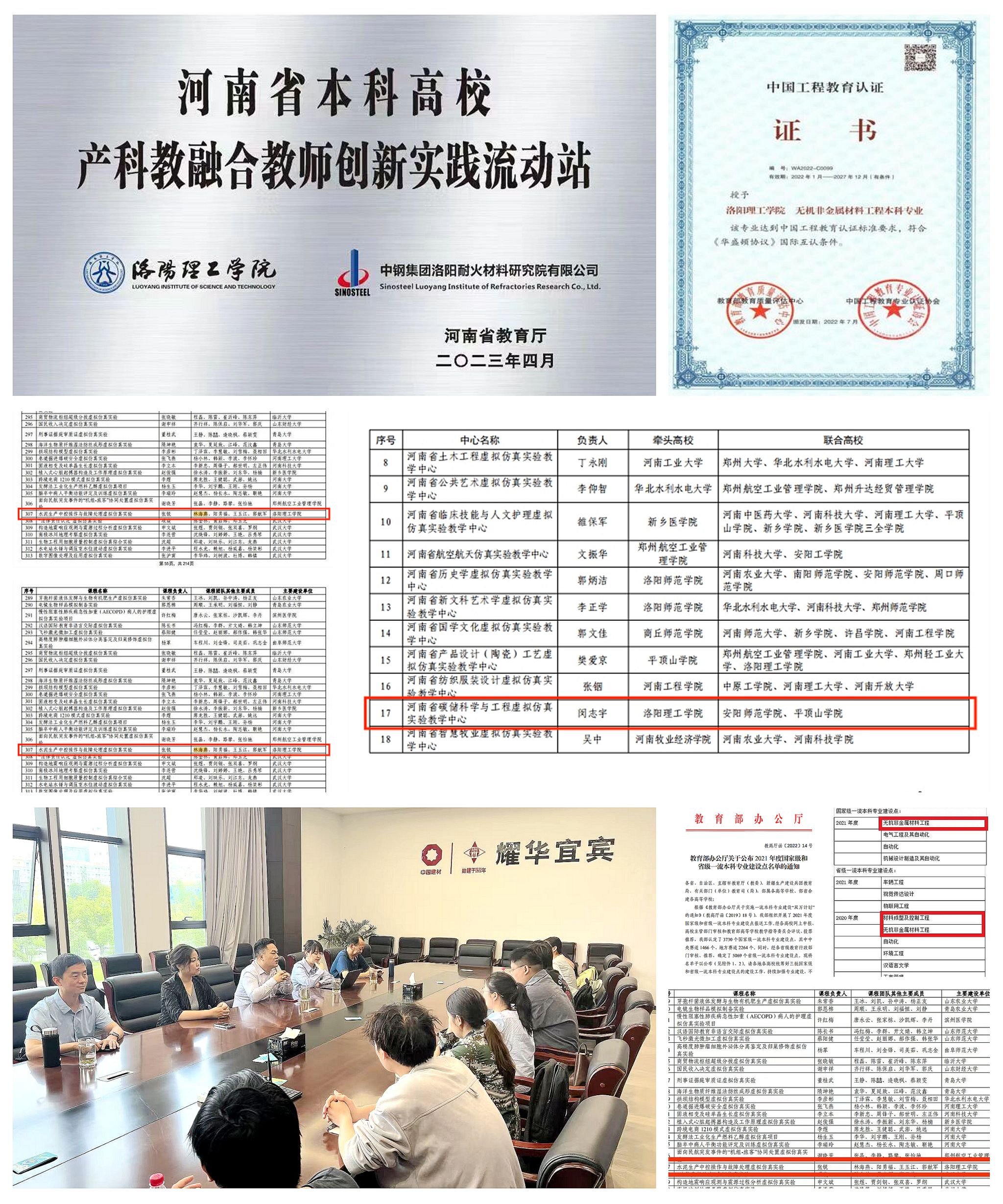 新工科(材料科学与工程)大学生校外实践教育基地获得省教育厅直接认定,获批河南省本科高校产科教融合教师创新实践流动站。获批1门国家级一流课程、1项本科高校2023年度产教融合研究重点项目。获批国家自然科学基金青年科学基金项目1项,省部级科研项目立项6项,其中河南省重点研发项目1项;获省部级以上科技奖励3项;建筑型材先进成型技术产业学院获批立项建设;完成“河南省碳储科学与工程虚拟仿真实验教学中心”和6个材料学院负责的河南省虚拟仿真项目的建设任务。承办或协办先进材料设计与功能优化暨第三届全国电磁功能材料会议等省级以上学术会议3场。2023年和2024年引入科研经费分别为1001.8万1702.73万元,引进经费总额均位居全校第一。与海螺集团、中国耀华玻璃集团、尧柏特种水泥集团、北京利尔公司等行业龙头企业深入合作,共建河南省智能化绿色建材产业学院,促进产学研深度融合。实现党建与业务工作在目标上的一致性、在任务上的统一性、在效果上的互促性,真正做到齐抓共管、互为促进的“一盘棋”。